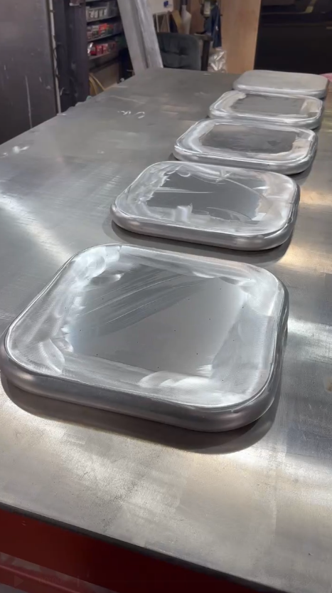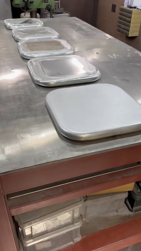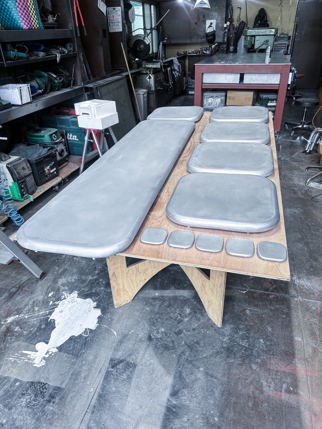 トレーは、表参道店で象徴的に用いられてきたアルミ素材を踏襲しつつ、伊勢丹新宿店独自の造形として再構築している。40φのアルミパイプを曲げてフレームを成形し、トップにはアルミ板を溶接。さらにバイブレーション仕上げを施すことで、硬質でありながら柔らかな表情を持つ一体的な塊へと仕上げた。