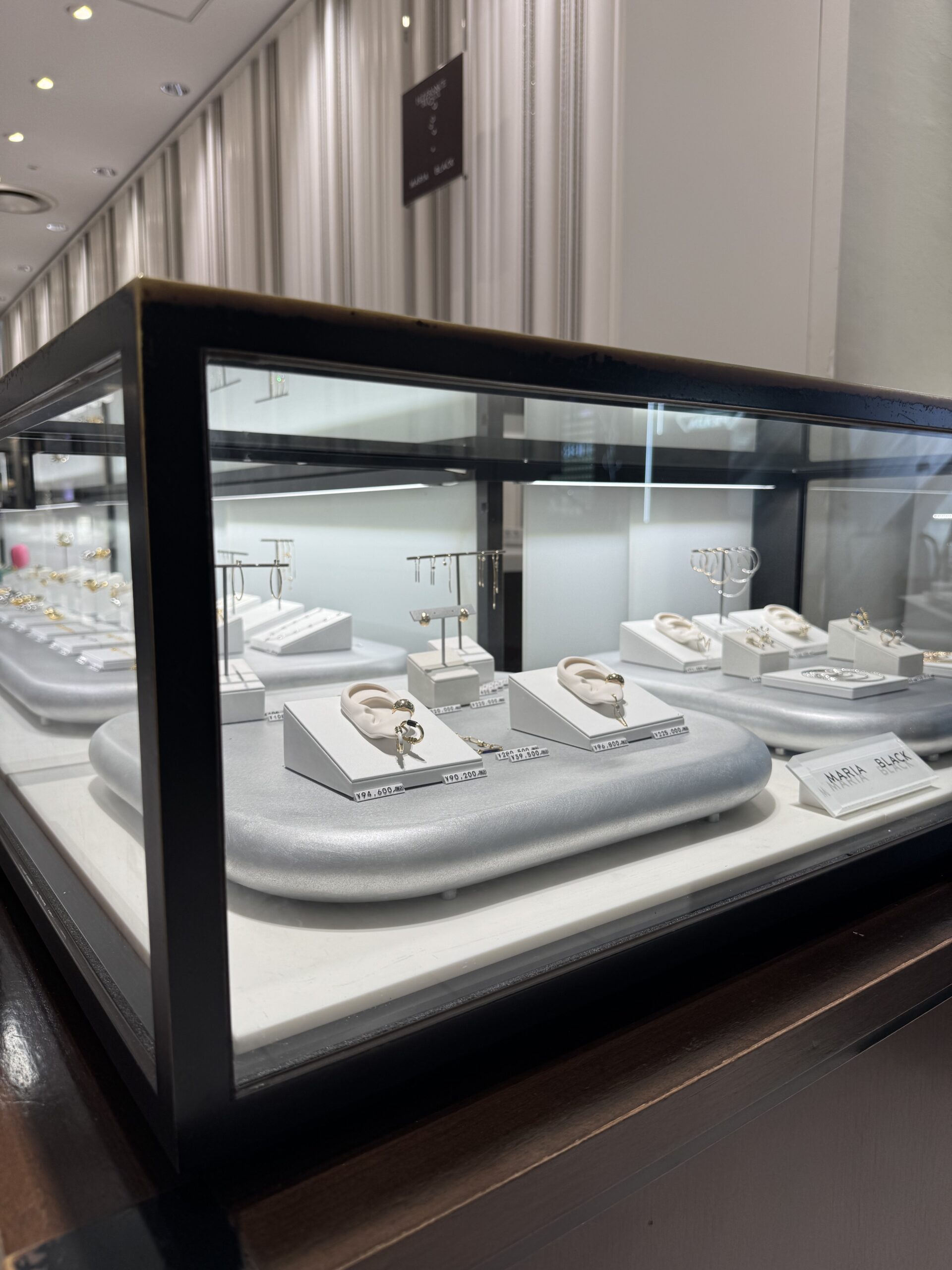 Following the opening of its Omotesando store, MARIA BLACK is set to launch a new location at Isetan Shinjuku. The design challenge for the first-floor counter was to clearly express the brand’s identity within the limited space of the existing glass showcase. To achieve this, we focused on the jewelry “tray” as the primary design element, combining it with fixtures supplied by the brand’s headquarters to create a composition that conveys the presence and worldview of MARIA BLACK.